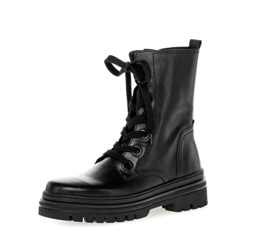 Schöne Damen Stiefeletten von Gabor aus einem feinen hochwertigem Glattleder. Die Laufsohle ist aus Gummi. Der Artikel verfügt über einen Schnürverschluss.