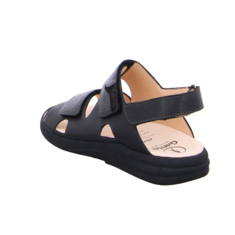 Komfort-Sandalen für Herren von der Qualitäts-Marke Ganter aus einem feinen hochwertigem Glattleder in der Farbe schwarz. Das Außenmaterial ist pflegeleicht und so leicht mit Wasser und Pflegemitteln zu reinigen. Innen ist der Schuh mit einem cromfrei gegerbtem Leder ausgestattet. Die Decksohle ist aus echtem Leder verarbeitet und bietet optimalen Halt und Luftdurchlässigkeit. Der Schuh hat eine normale Weite. Der Absatz ist durchgehend flach. 2 cm. Die Sohle ist als flexible Laufsohle hergestellt, so dass das Tragen den ganzen Tag über kein Problem ist und der Fuß leicht abrollt. Der Klettverschluß zum einfachen und bequemen an- und ausziehen sorgt für einen guten Halt an Fuß. Ebenfalls ist eine stufenlose Anpassung an den Fuß möglich. Die runde Schuhspitze macht den Schuh elegant am Fuß und hat genügend Platz für Ihren Fuß und Ihre Fußzehen. Das Besondere an diesem Schuh ist der gepolsterte Lederdecksohle, die einen hohen Tragecomfort den ganzen Tag ermöglicht. Die Schuhe sind ideal für die Freizeit, da Comfort, Tragegefühl und Verarbeitung so ausgerichtet sind, dass Sie den ganzen Tag ohne Probleme tragen können.